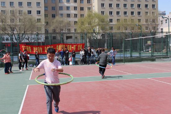 总计7个团支部报名参赛。参赛队员转着呼啦圈走过20米折返,再将呼啦圈传递给下一个队友,以总计耗时来决定名次。比赛现场紧张有序,选手们在比赛过程中或敏捷、或笨拙的脚步,密切配合的团队氛围以及不甘示弱的精神面貌,使现场气氛达到了高潮,欢笑声、呐喊声,不绝于耳,运动场成了欢乐的海洋。