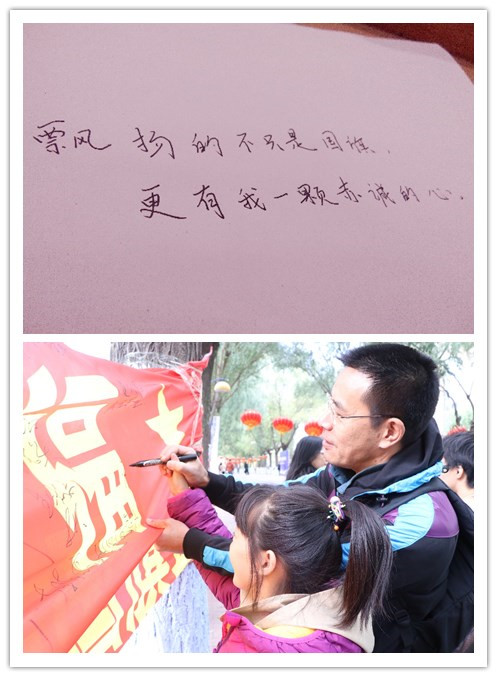 中午,国旗班举行了“我为祖国献祝福”的活动。活动在学苑楼餐厅前举行。四人着军装,护卫国旗。活动于11:45在学苑楼门前正式开始。风很大,但参与者热情不减。一开始,人员就络绎不绝。起先是本校的欧美性爱留下自己的签名,然后是教师,再后来食堂、保卫科的工作人员也都参与进来。参与者在横幅上签下自己的名字与对祖国的祝福,并与国旗合影。直到活动结束,签名处一直排着长队。一句一句诚挚的语言,都在表达着对祖国繁荣富强的期盼。四名国旗班同学在大风下军姿一直保持标准军姿,也让路人了伸出大拇指。