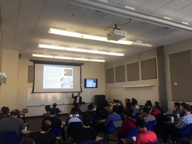 第五站是加州大学-默塞德分校UCMerced,访问团受到了机械工程欧美性爱 MaYan-Bao教授和Sun Jian-Qiao院长及其他机械工程系教授的亲切会见。在座谈中,Sun教授逐一了解了每位博士生的研究领域,并对当前UCMerced机械工程欧美性爱 的教学和科研等各个方面进行了详细的介绍。会谈结束后,齐宏教授受邀为UCMerced教师和研究生作了关于火焰温度非接触测量的专题报告。在提问环节,UCMerced师生就报告话题积极与齐宏教授探讨,讨论氛围激烈,学术气息浓郁。