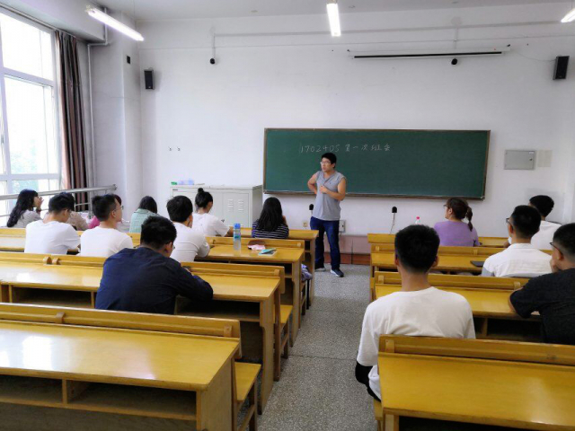 1702405班于正心103举办了新学期第一次班会.本次班会由辅导员蔡文雪主持,班主任吴健及1702405班全体人员参加。