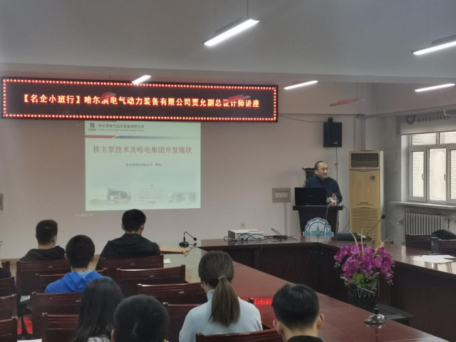 贾允先生不仅是哈尔滨电气动力装备有限公司的副总设计师,他也是公司的产品检验部部长,研究员级高级工程师,黑龙江省领军人才梯队带头人,贾允先生为1702405和1702501两个班的同学带来了主题为“我国核主泵产品发展现状及哈电集团主泵技术优势”的报告。首先,他用通俗易懂的语言为大家介绍了我国核主泵产品发展现状,核主泵产品核心技术以及及哈电集团的技术优势。紧接着,他讲述了自己作为大型国企技术人员的成长经验,他告诉同学们只有活用好在学校的知识,结合好企业经验,在工作中敢于向前辈师傅请教才能在企业中有更好的发展。讲座最后同学们提出了有关于工作环境,工资待遇,职业发展晋升路线等方面的问题,贾允先生都耐心为每个提问的同学答疑解惑。