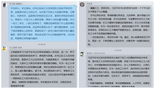 研分会成员郑思远说,值此百年校庆之际,在校庆典礼上喜闻总书记贺信。总书记对哈工大的发展提出的明确要求,就是对我们每一名工大学子的明确要求。在新的起点上,立足航天,服务国防,面向国民经济主战场,不断改革创新,奋发向上。一代又一代的工大学子在历史和时代的洪流中,选择了将个人发展与祖国命运紧密相连的发展道路。用自身严谨朴实的哈工大规格和扎实牢靠的哈工大功夫献身这个伟大的时代。我们要把在哈工大学习生活中的点滴积累凝炼筑牢,主动将自己事业发展融入国家发展道路。