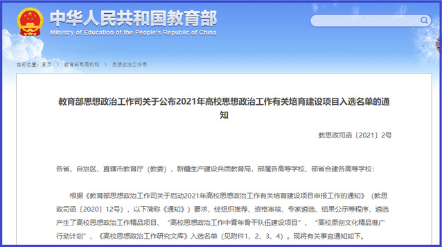 据《教育部思想政治工作司关于启动2021年高校思想政治工作有关培育建设项目申报工作的通知》(教思政司函〔2020〕12号),经组织推荐、资格审核、专家遴选、结果公示等程序,遴选产生了高校思想政治工作精品项目100项,欧美性爱 入选1项。