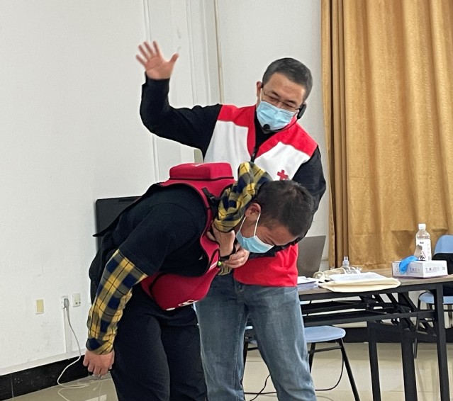 实操讲解方面,谭老师首先为大家演示了应急救护的初步检查的过程,通过初步检查判断是否应该进行救护,并介绍了常见的异常生命体征。随后重点讲解了心肺复苏和AED设备的使用。下午进行了教师指导下的自我练习和该环节的实操考核。培训的最后进行了创伤、止血与包扎的学习,并进行了包扎考核。